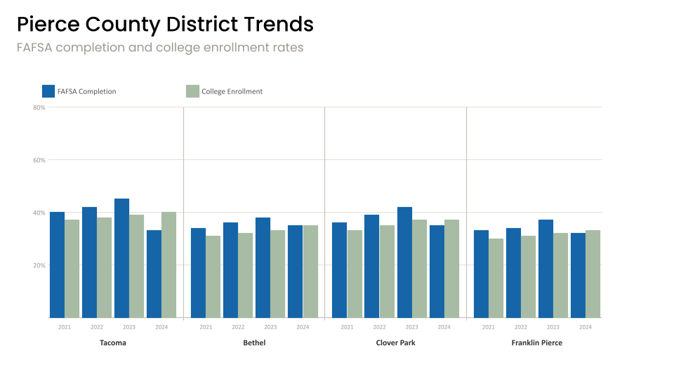 In King County, the Renton Promise offers a powerful example of what coordination can look like. By wrapping advising, navigation, and direct financial support around students at the moments they are most likely to disengage, Renton saw FAFSA completion climb from 44% to 65% and college enrollment reach 68%. Pierce County districts, in the same period, held steady around 35-40%.