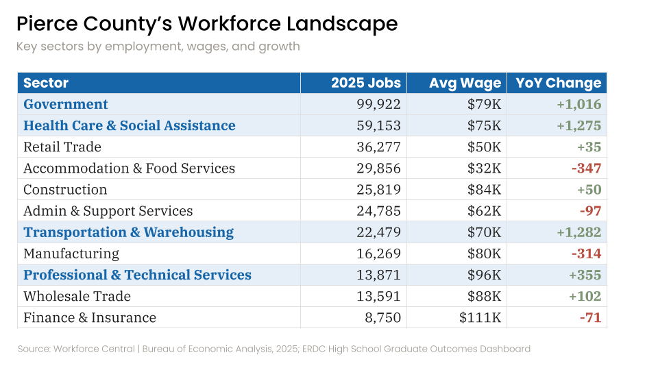 Pierce County’s economy has real strengths to build around. Government and healthcare together account for nearly 40% of the county’s jobs, with above-average wages. Transportation and warehousing added over 1,200 positions last year, the largest private-sector gain in the region. Professional and technical services average $96,000 annually. The jobs are here. The opportunity now is to build the pathways that connect our students to them.