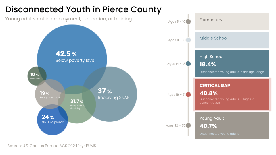 At the center of all of this are the young people we are building for. Roughly 14,000 young adults in Pierce County {ages 16 to 24) are currently neither in school or working, with the highest concentration between ages 19 and 21, the exact transition window where coordinated support matters most. This number has held steady since 2013. Not for lack of commitment across our community, but because commitment alone, without coordination, has a ceiling.