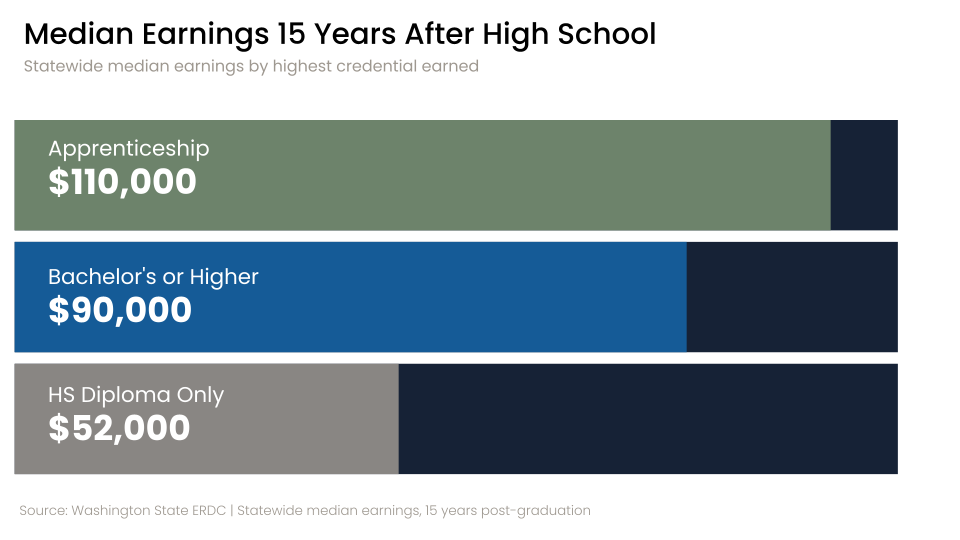 In Washington, the value of a postsecondary credential is clear: fifteen years after high school, a diploma earner averages $52,000 annually, while those with a bachelor’s degree earn $90,000, and apprenticeship graduates reach $110,000. These aren’t just statistics. They are the foundation that shapes what kind of life our students can build.